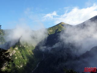 そこからは四合目までと比べて少し傾斜の緩やかな斜面になり、稜線を進んで行く。 20分ほど歩いて五合目の標識が出た。少し展望が開けて東側の斜面が朝日に当たってきれいに見えるが10人くらいの団体が休憩しており狭かったので、休まずに進む。 道は引き続き樹林の中を着実に高度を上げていく。元気な中高年はさっさと自分を追い越していく。 相変わらず自分の歩くスピードの遅さに嫌気がさす。道は稜線の西側にとりつき次第に左前に、割引沢がよく見えるようになる。 7;31に6合目で休憩。 お茶を飲む。 近くにいた登山者にシャッターを押してもらい割引岳をバックに撮影。 7:37出発。樹林は次第に薄くなり、先に進む稜線の様子が見えやすくなってくる。 朝日が照り始めて、少しずつ厚さを感じはじめる。 8:14、7合目で再び休憩。ここは、岩場になっており、眺めがある。 給水したあと日焼け止めクリームを塗る。 8:17出発。 |