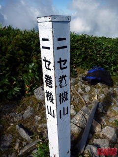 9:15に避難小屋によって見る。 以前登ったときにここに避難小屋があったという記憶はない。 結構新しい小屋なので、その後できたものなのだろう。 残雪期にスキーをかついで一泊でここに泊り、星空を楽しみ、山肌にシュプールを刻むことができたらさぞ楽しいだろうと想像する。 トイレをしたあと、最後の登りをがんばって進む。 すぐに24人の集団を抜かさせて、また、自分の遅さに嘆かわしいと思う。 9:45、巻機の頂上と書いてあるところに到着。 地図上ではここは、御機屋といわれる稜線上の分岐点で、性格には最高峰はそこから東に40mほど登ったところのはずなのだが、おそらく、最高地点はただっぴろくて山頂を特定しづらいためにここを山頂と定めたのだろう。 19年前にはここにも先にも山頂の標識はなかった気がする。