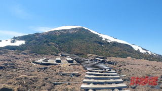 標高2000m 11時44分に高天原と呼ばれる場所に到着した。 ここは雪原を乗り越えて、すこし雪が融けた夏道の尾根に出る分岐点だった。 ここからしばらくは夏道の遊歩道の木製階段を進んでいく。 下って来た人が、頂上直下はまた雪原となるので、アイゼンはそのまま外さなくてもいいんじゃないかと言う。 少し歩きにくいが岩を避けて進んでいく。