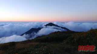 14:44まで山頂でゆっくり過ごした。そこから小屋に向かって歩き出す14時55分、避難小屋に到着。 この前は最初登りだしてすぐに追い抜いてていった方が迎えてくれた。 1階に既に到着した3人組がいたが、小屋の2階にも10人以上宿泊することができる。あとで越後駒ケ岳の方から6人ぐらいのパーティーが来たが、彼らは皆2階へと上がっていった。夕方小屋の外に出て雲海に浮かぶ虹を見た。夕方になってガスが下がると荒沢岳だけも眺めることができた。 西に沈む夕日を見て小屋中でカレーを食べて持ってきた焼酎を船橋から来た3人組にも振る舞って楽しい山談義をして20時半に寝た。