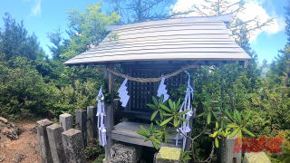 10時37分、北岳山頂到着。 奥の稜線を見ると、燕山荘は綺麗に見えていたが、北岳の山頂にはガスがかかっていた。 ここから稜線に沿って進。隣の中岳には祠がある。 たくさんの人が祠の前で休んでいた。 今日は奥社祭の当日であり、まもなく神事が始まるようである。
