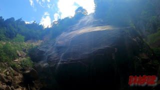 14時14分、広くなった沢沿いに出ると白河滝があった。 細かな水を垂らしており見事な景観であった。 ここで15分ほど休憩をする。 白河滝を出てからしばらくすると前に妙見の滝が見えてきた。 ここから今日一番の難所があった。 鎖をつかまりながら滝に沿って降りていくのである