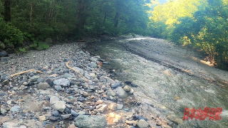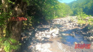 途中、千軒銀座を過ぎてから樹林をまたいだときに、今回準備した秘密兵器の「クマおぼる」を落としてしまい、もどって回収した。金山番所跡を過ぎてからもホイッスルを吹きながら歩く。90分で登山口に行けるように道標には書いてあるが渡渉もありそんなに早くは進めない。 広い川原に来てからもスニーカーに履き替えて、渡渉後また登山靴に履き替えるというので手間どる。その後も、意外と高巻きの箇所が多く、終盤にきての登りでこたえる。