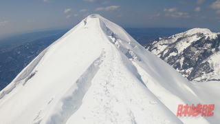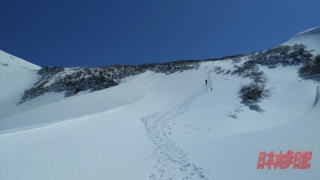 午の背からは先稜線伝いに行くよりも直登ルートを取った方が楽だよと教えてくれた。 午の背のところで後ろから来た男性のソロ、この方はワカンをつけていたが、先に行ってもらう。 そうこうしているうちにその後ろに来たスノーシューの人も自分を追い込していた。 スノーシューの方はピッケルを持っていなかったが歩きなれているようで安定した足取りだった。 途中で少し息を整える。ここから九合目の地点まではルートを左に巻くようにして進むのだが、ハイマツ帯を越えたところで、雪にズボッと落っこちてしまった。 腰まで落ちてしまい、なんとか這い上がったが、外に出てみると左足につけていたアイゼンがない。 てっきり穴の中で落としたものだと思い探してみるしかしながら見つけることができない。 途方に暮れて穴を掘り疲れて休んでいると、後ろから来た2人組の人がなんと私のアイゼンを持って来てくれた。 実は穴の中で落としたのではなく、もっと前で足から外れていたのを気づかずに歩いていたようである。 とにかくアイゼンが見つかってよかった。 これがないと下山できないところであった。 その方にお礼を言って改めて左足にアイゼンを取り付ける。