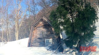 彼らとすれ違った後、割れている地点に来たら一応自分の足幅だと跨いで通ることができた。 ただ午の背は、往路で通った時よりも帰りの方が険しい登りに見えて恐怖感はあった。 七合目を目指して降りていく。 雪庇の近い所をそうなる避けるように気をつけながら下って行く。 七合目で休憩、粟ヶ岳および守門岳の姿に別れを告げて雪の斜面を下りていく。 降りて行く途中でカメラをセットして自分の動画を撮影してみた。 14時10分、避難小屋に到着。 せっかくなので避難小屋の中を覗いてみることにした。やはり屋根が壊れているということで中に雪が吹きだまっていた。 これだとなかなか寝るのは苦しいかもしれない。 避難小屋を出てやはり足跡を辿りながら忠実に降りていく。 四合目あたりではもう雪が完全に融けて夏道を下りていく。 元地のあたりからまた樹林の中で雪の中の歩きになる。 渡渉地点は来るとき同様結構気を遣ったがやはり靴を少し濡らしてしまった。 鉄の橋を過ぎると正面に猿飛滝が見えた。ゴールは近い。