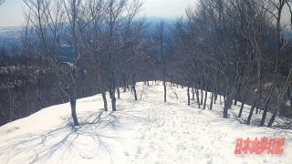 12時56分下山開始、雪面にアイゼンのかかとをさしながら降りていくのは気持ちの良いものある。 右手前を見ると午の背のあたりで先ほどの2人組が休憩しているのが見えた。 先ほど自分がハマった穴の証拠写真を撮影した後に、九合目から松の方に降りていく。 やってきた別の2人組とすれ違う。 融雪で一か所大きく割れているところがあり、そこをまたぐのに女性が苦労したということで教えてくれた。 登りのときは割れているところはなかったが、やはり一日でだいぶ雪が融けてルートの状況が変わってしまったのだろうか。 午後になって温度が高いので雪崩や雪庇の崩落を気をつけなければならない。