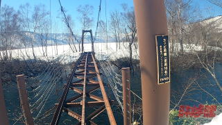 前を見ると東へ向かって進んでいる登山客がいる。上の大堀川橋を渡るところで山ノ鼻へ向かう登山客が中間地点で待っていてくれた。9:15、牛首分岐を北東へに進む。ここからは登山者がめっきり少なくなる。東電小屋まで行くこのルートは途中で二箇所沢を渡るところがあるか、この時期はまだ橋の踏み板を取りつけていないので、橋の枠だけを歩くというスリルのあることをしなければならない。 ヨッピ吊り橋はさすがに高さもあり怖かったが、手前でアイゼンを外して、リュックにアイゼンをくくりつけたまま慎重に進んでいった。