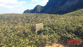 14:29冠山山頂出発。 ロープを使って降りるところは慎重に下って行く。 今日は登山靴ではなくトレランシューズなのでこういう道ではあまり踏ん張りがきかない。 これでも滑らないようにして分岐までたどり着く。 せっかくなのでここから冠平まで行ってみることにした。 冠平はテントか2-3張、張れるれるような平坦な場所であった。 横に山頂を眺めるように小さな石の遭難碑があった。1955年に福井銀行のパーティ24名が遭難し、2名が低体温症で死亡した事故の慰霊碑である。 11月に天気が悪くなるとこの山は冬山になるのであろう。