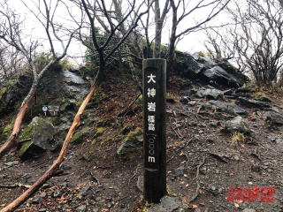 Cコース縦走線のルート上に道標が整備されており、あと何キロと距離を書いてくれているので距離感がわかる。 16:10出発して1時間強立ったところで大神岩に到着した。 ここがちょうど標高1000mの場所である。 「神仏ポイント」と書いた看板があり、岩に宗教上の文字が彫ってあることを示していた。 大神岩の上に登ってみるが眼下は雲に覆われており展望なし、残念である。