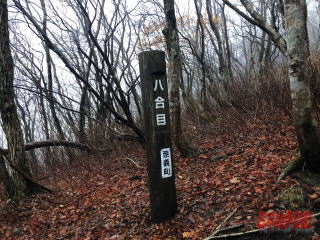 大神岩を出てやや傾斜がゆるやかになってきた。 16:38に八合目到着。 山頂まで1.1㎞の標識が現れそろそろ日没までの時間が気になる。 歩きだしのときに降っていた雨は幸い上がり、一方で前線が通過したのであろう、明らかに気温が下がってきた。 またビュービューという音をたてて風も吹き始めた。 たった一人で歩いているとやはり不安になる。気ばかり焦って少しオーバーペースになってしまう。