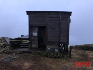 17:09、山頂へ向かって歩いているときについに避難小屋が現れた。てっぺんに煙突があるので皆さんが写真をアップしているものに間違いない。 ようやく今夜の宿に無事到着である。 扉の建付けが悪いというようなヤマレコの書き込みもあったのでもし扉があかなかったらどうしようかなどと思いながら恐る恐る開けてみたが問題なく鉄のドアはあいた。 中へ入ると風が来ないので急に暖かく感じた。 土間敷きで20人ほどは宿泊可能だろうか? 煙突の下には炉のようなところもある。