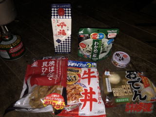濡れた衣類を着替えて夕食の支度である。 今日の晩飯はα米・牛丼と缶詰のやきとり、食後の酒は日本酒であてにはおでんと貝ひもとなかなか贅沢である。これに水を5Lかついできたのだから、確かに荷物が重いはずであろう。 ラジオは入ることは入るのだが、外の風が強くてなかなか聞き取れないので、スマートフォンのバッテリーがまだ入っていることを確認して、ブルートゥースヘッドホンと接続して、音楽を聴いた。 日本酒を飲みながらスピッツのCDアルバム「花鳥風月+」を聞くとなかなか心に染み入るものがある。 たった一人の避難小屋でEPIの火で濡れた衣類を乾かしながら夜8時に寝袋にもぐりこんだ。