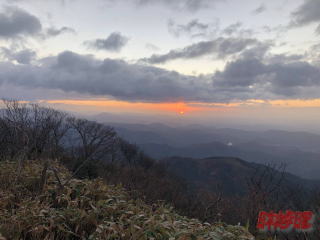 稜線を歩いて東へ進んでいるときに明るくなってきた東の空からご来光が上がるのが見えた。 もう山頂は出ていたが見事な朝日にもう一度荷物を降ろしてスマートフォンでご来光の動画を撮影した。ラッキーなことに今回4日間の日程で3日目に悪天にはあたったが、2日目と最終日4日目の2回、見事なご来光を見ることができたので満足できた。 炊事道具や寝袋を山頂避難小屋に担ぎあげるということはそれなりの苦労はあるものの相応のご褒美があるのだと改めて感じた。