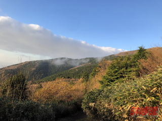 6:50分岐に到着。ここから縦走線(Cコース)が蛇渕滝線(Bコース)と菩提寺線(Aコース)に分岐する。 自分はこのまま最短で下山するのでBコースの方面に歩を進める。 南向きの稜線を見ながら、整備されたクマザサと灌木の道を下っていく。 終始見晴らしはよい。 途中、樹林帯に入る手前で休憩。 空の青、雲の白、山肌の黄色が見事なコントラストを見せている。 中腹から見る稜線であるが圧巻の景色である。
