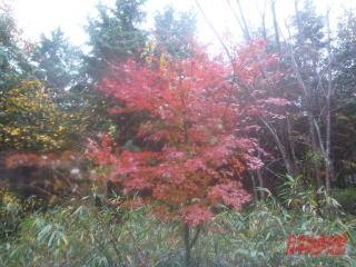 登山口からCコースにルートをとり登り始める。 雨が降って喜んだのか、登山道に大きなミミズが出てきている。 15:17再び那岐山山頂と蛇渕の滝の分岐の道標がある。 ここからしばらくは植林された杉林の中を進む。 正面の山肌の紅葉がちょうどよい色合いを見せている。 15:30水場を通過。 これだけ雨が降っている割にはパイプから出ている水は少量でタンクや水筒に汲むには時間がかかりそうである。 自分は、駐車場を出るときに水を満タンにしているのでこの水場は通過する。