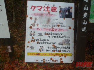 蛇渕瀧の入り口を右手に見ながら林道を進む。 やがて、氷ノ山後山那岐山国定公園の標識がある。 1969年に指定されたらしい。 実際に岡山県の最高峰は後山1344mなので、今回の那岐山ではない。 さらに進むと登山道の概略図の標識があった。 今回は縦走コース(Cコース)2.4㎞を上がり、避難小屋で宿泊したあと翌日23日朝に那岐山登頂、蛇渕瀧コース(Bコース)2.9㎞で降りてくる予定である。 登山道の入り口に「クマ注意」の標識がある。 本当にここでの目撃情報があるのだろうか? あとでインターネットで検索したら、2013年4月のヤマレコに登山者がクマを目撃した情報があった。まさにこの登山口のところである。