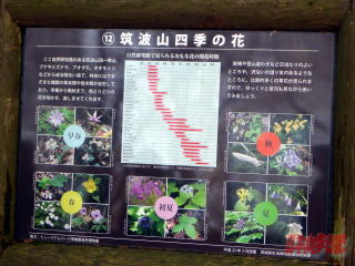 10:30筑波山自然研究路の探索開始。 筑波山自然研究路はぐるっと一周60分のコースである。 昭文社の地図には時計回りがよいと書いてあるが我々は反時計回りに歩くことなる。 さっそく。筑波山四季の花の看板がある。 なるほど、筑波山は春から秋までたくさんの花を楽しむことができるようだ。 ただ一時崩落があって通行できなかったようである。