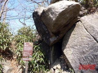 昼食が住んで12:12、パラボラアンテナのある女体山に向かって出発である。 せきれい茶屋をすぎたところにガマ岩という場所がある。 確かにガマの口のように見える岩である。 下に落ちている小石をガマの口の部分に投げ入れて落ちてこなければ立身出世がかなうとあるので、3人とも必死になって石を投げ入れようとする。結果は。。。
