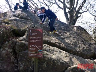 たくさんの登山客とすれ違いながら、岩場を登って12:31に女体山の山頂に到着。早速御神殿でお参りをする。 男体山の御神殿より少し大きいだろうか?女体山は岩が重なりあって山頂部を形成しており、岩に張り付くようにして休憩していたら上からA.Kさんが写真を撮ってくれた。 これが構図としてなかなか面白いものになっていて、バックに男体山の山頂部が入るというユニークなものである。