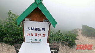 ニセコアンヌプリに入山したときと同じような、木のボックスがあり、入林届けを記入する。 届け出のノートの中身を見たらもちろんこの日の入山の記録にはも誰も名前を記入していない。 まあ、この天気では当たり前ということだろうか。 とりあえずの分岐まで25分歩いてみることにした。先ほどまでの遊歩道とは打って変わって、 ここからは本格的な登山道になった。結構な岩の間を歩くようなところもあり、2020年に雲ノ平に行った時に薬師沢から登ったコースを少し思い出したぐらいの普通に登山道である。 コースタイム25分よりももう少し時間がかかったが、イワオヌプリとチセセヌリと分岐に到着した。