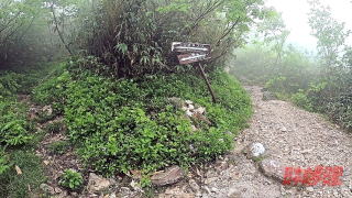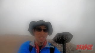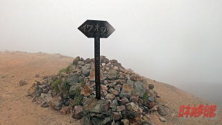 外輪山の稜線に沿って登るのだが、これもニセコアンヌプリと同じで南側の稜線はかなり強い風が吹いていた。 しかもガスが濃く、ルートを示すピンクテープがところどころ木の杭に結び付けられているのだが、 視界が悪くてそれを発見できないという重大な危険場面が時々あり、 本当にこのまま山頂まで進んで大丈夫なんだろうかと不安になる。 山と高原地図にもイワオヌプリ山頂標識の近くには視界不良時注意と書いてある。 視界が厳しいだけでなく、遮る樹木がないために、突風が吹いているような状態になった。 11時45分とりあえず見えている最も高いところに到着した。 そこにイワオヌプリの山頂の標識があった。