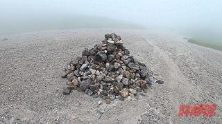 分岐からは一時間でイワオヌプリの山頂まで行けるようであったので思い切って行ってみることにした。 登山道の入り口でもクマの目撃情報があったので、少し樹林が濃くなっていることもあり、ホイッスルを拭きながら歩くことにした。 15分ほどで少し開けた場所に出て、ここからは樹林の中というよりは火山を登っているような砂礫の中のルートになっていった。 11時20分、まわりが開けてケルンが積んであるところに来た。 ここからイワオヌプリの外輪山の周回コースとなる。 本当は外輪山の周回をしたかったのだが、ガスが出て道がわかりにくいこともあり、 周回コースをとるのをあきらめて、南側ルートから直接イワオヌプリの山頂を目指すことにする。